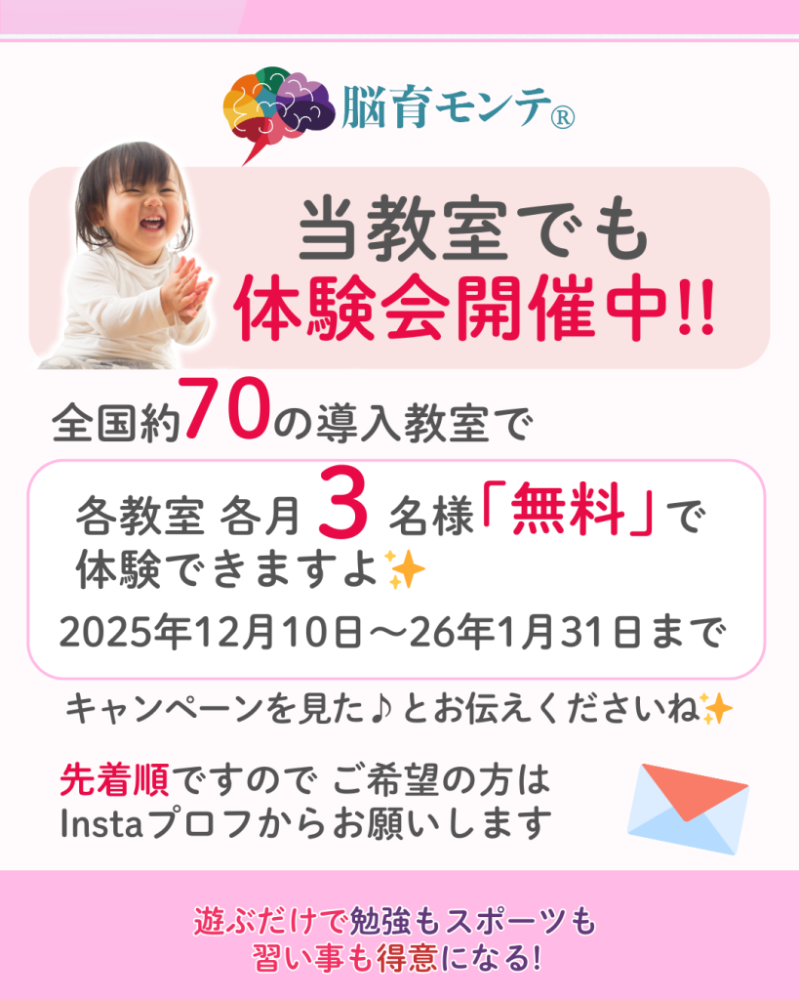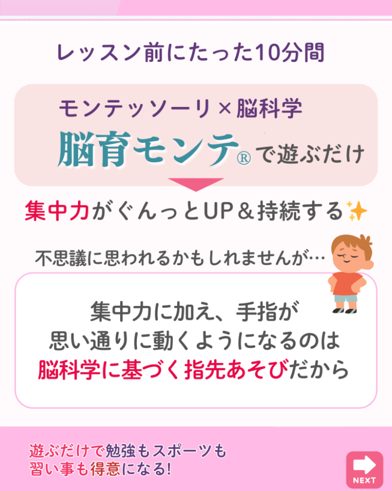 脳育モンテ®︎をレッスンに導入することにより、脳に良い刺激を与える事で、集中力が身につき、感情の切り替えもでき、算数まで得意になってしまいます!